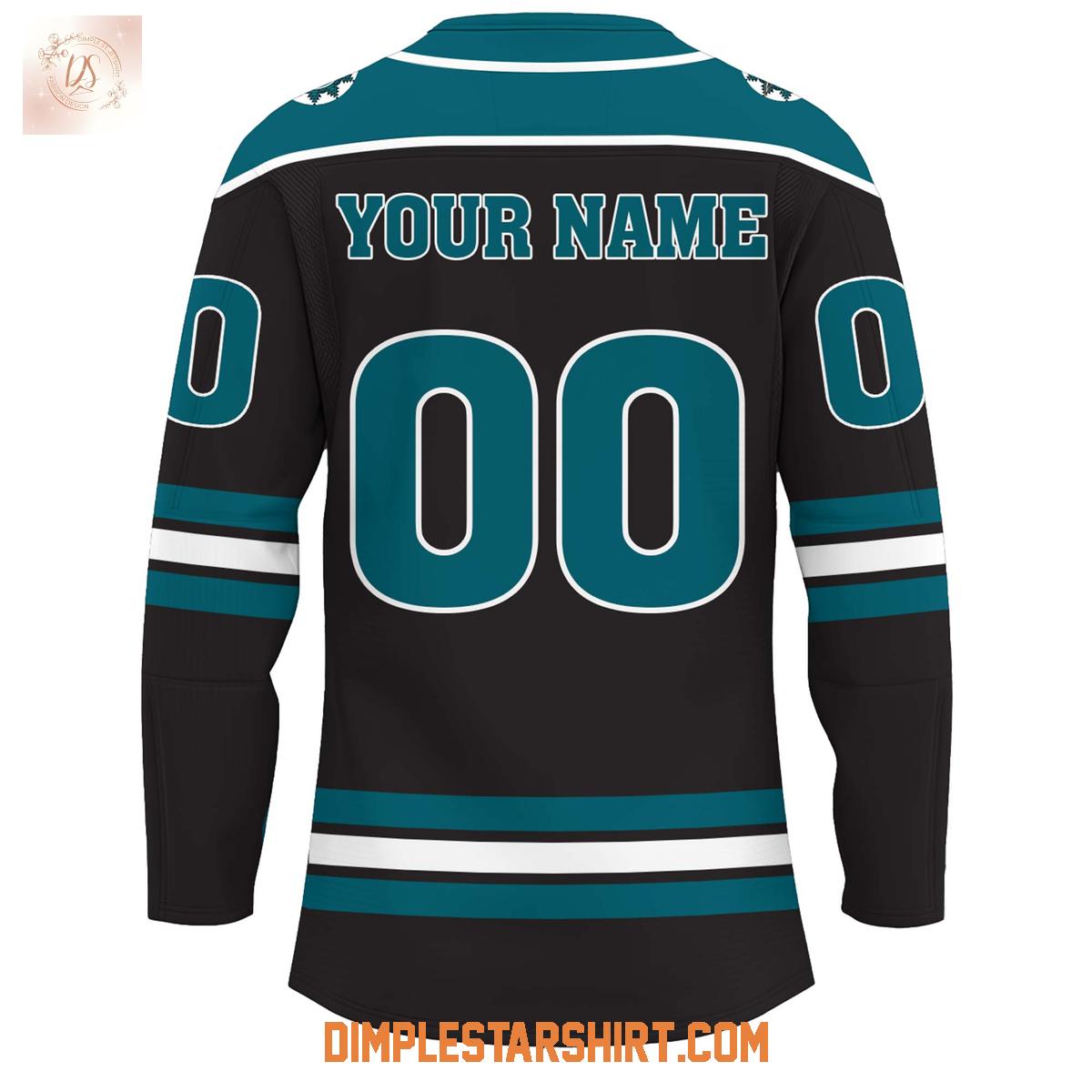 Crafted in the classic hockey jersey silhouette, this garment features a striking black body accented with the Sharks' signature teal and crisp white. Teal shoulder yokes are adorned with smaller, complementary circular designs, while bold white and teal stripes encircle the sleeves and lower hem. The V-neck collar, trimmed in white, adds to the authentic on-ice look, ensuring it resonates with true hockey enthusiasts.