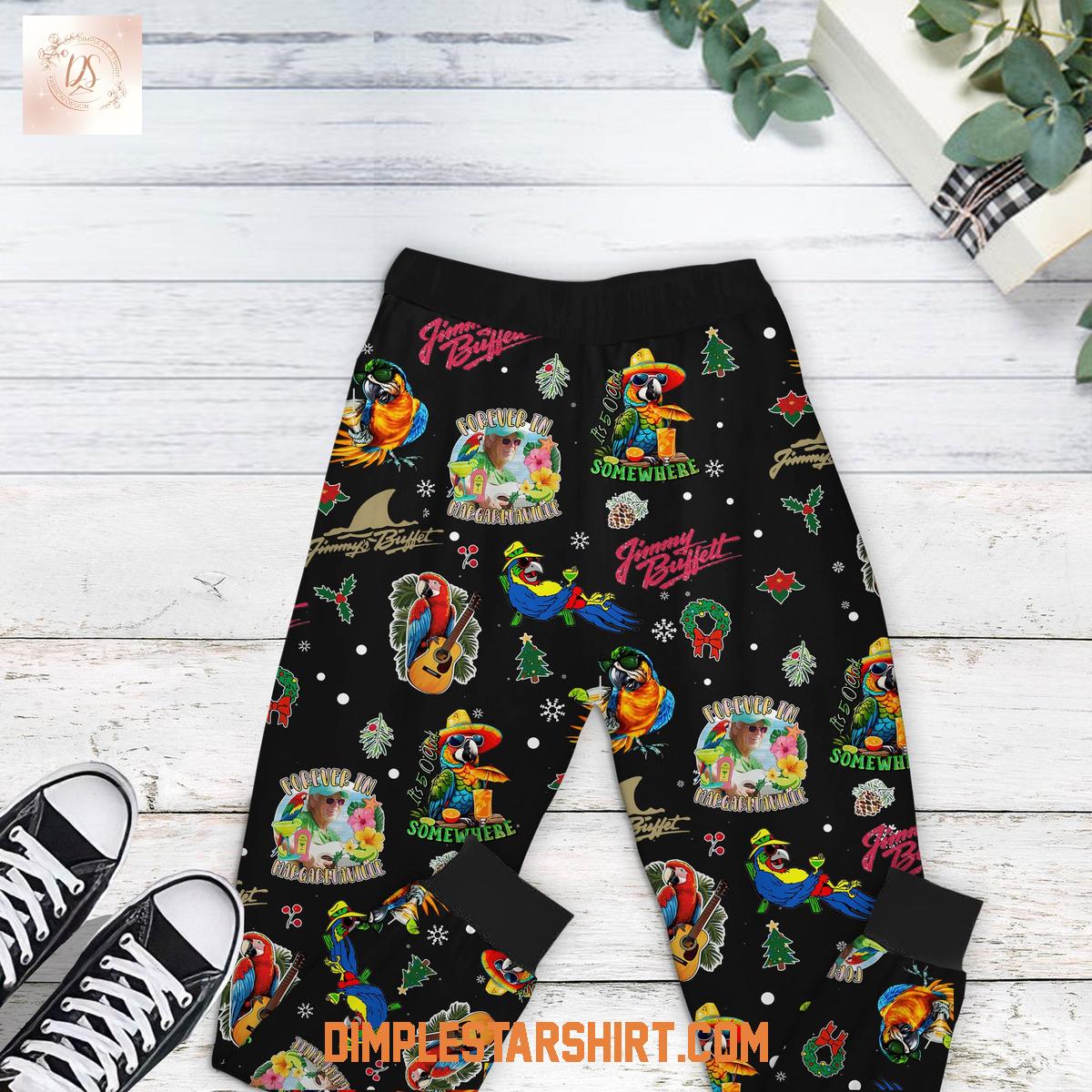 Complementing the shirt are the black pajama pants, featuring a lively, all-over tropical print. This vibrant pattern is a visual feast, showcasing colorful parrots, refreshing margaritas, unmistakable shark fins, and iconic phrases like "Jimmy Buffett," "Forever in Margaritaville," and "B5 O'Clock Somewhere." The subtle inclusion of festive wreaths and snowflakes suggests a year-round appreciation for the relaxed, holiday-like atmosphere Buffett’s music evokes, even during cooler seasons.