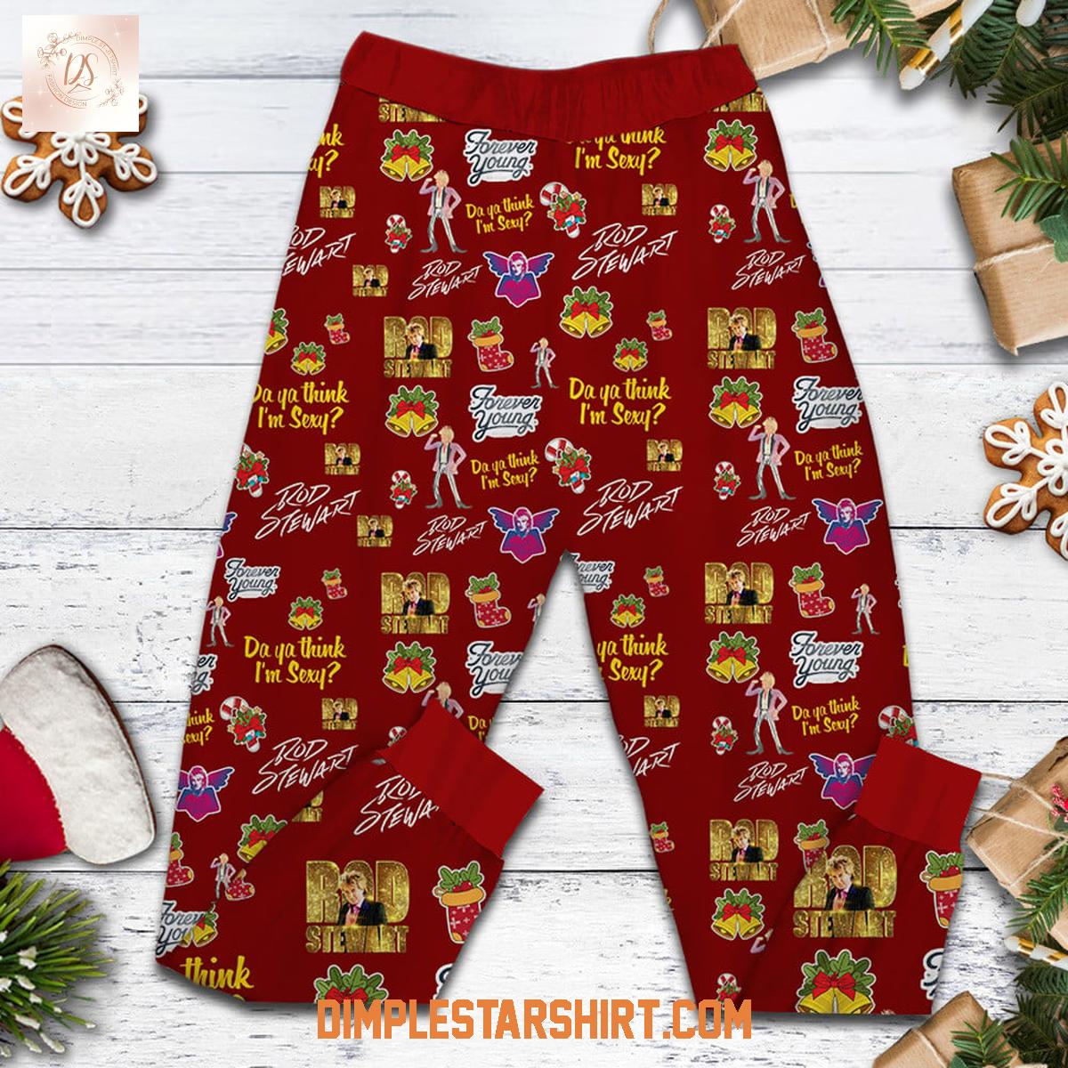 Complementing the top, the full-length pajama bottoms continue the festive Rod Stewart theme with an intricate, repeating pattern. Familiar phrases like "Da Ya Think I'm Sexy?" and "Forever Young" are interspersed with delightful holiday imagery – bells, stockings, and stylized depictions of the rock legend himself. The rich red fabric is visually soft, promising cozy comfort for lounging or sleeping, while the cuffed ankles ensure a snug fit. This cohesive design demonstrates a deep understanding of what true Rod Stewart aficionados appreciate.