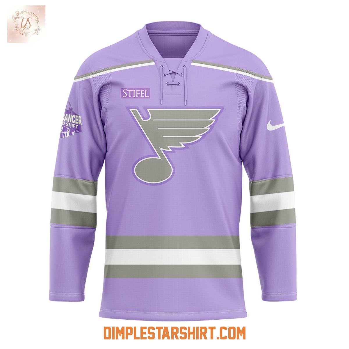 Crafted with thoughtful detail, the jersey boasts a striking lavender hue, a color universally recognized in cancer awareness efforts. The front proudly displays the classic St. Louis Blues primary logo, rendered in a sophisticated grey, harmonizing beautifully with the unique jersey palette. Above the crest, the Stifel sponsor logo is tastefully incorporated, while the traditional lace-up collar adds an authentic hockey aesthetic, familiar to true fans.