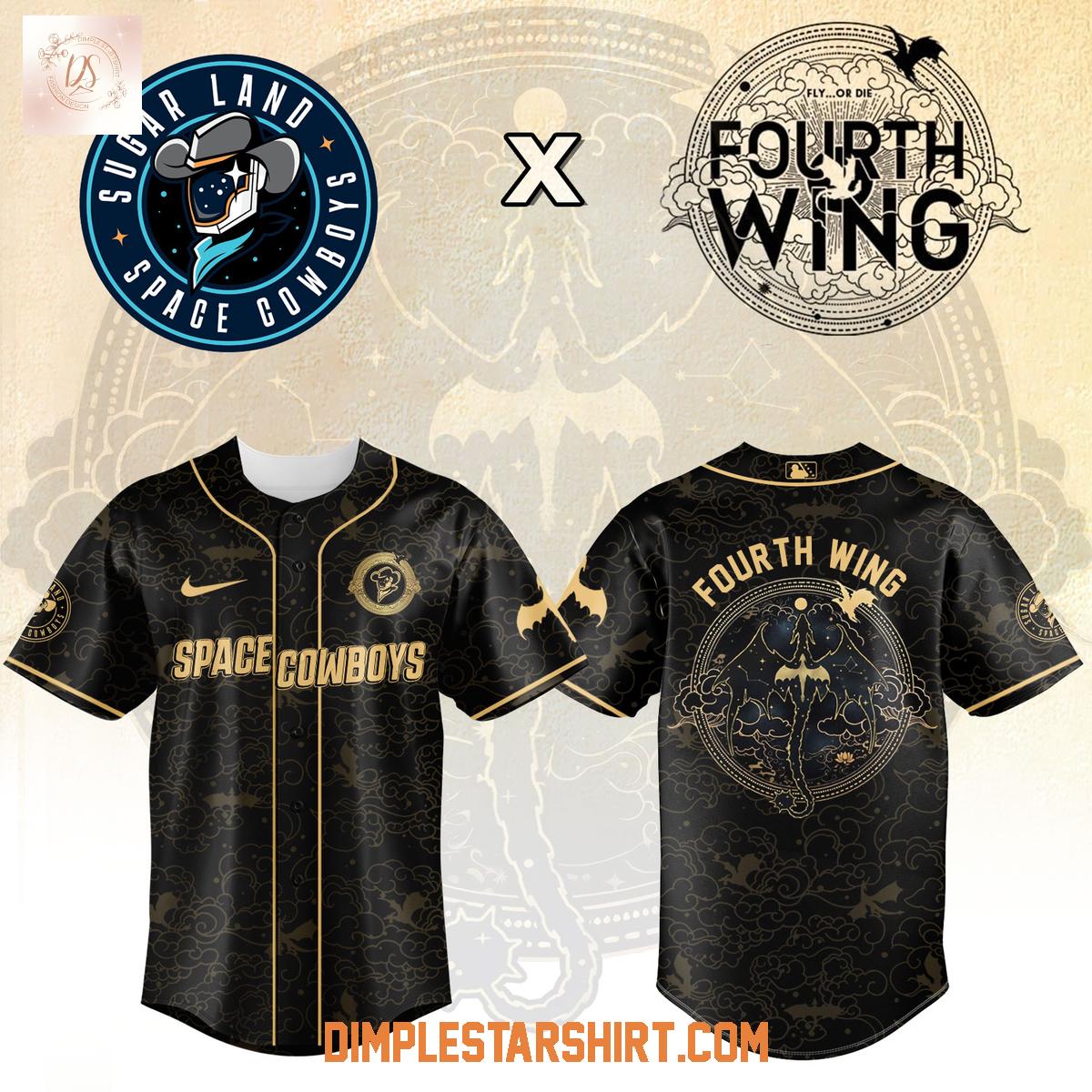 The jersey masterfully combines classic baseball aesthetics with iconic imagery from the Fourth Wing universe. The front of the jersey proudly displays "Space Cowboys" in a stylized, attention-grabbing font, while the back features a meticulously detailed "Fourth Wing" design, complete with striking dragon motifs. This intricate design incorporates subtle nods to both themes, resulting in a cohesive and visually appealing look that truly stands out.