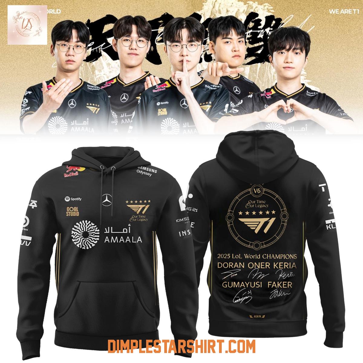 Embrace the unparalleled legacy of esports royalty with the T1 6 Time Lol World Champions Hoodie Shirt, a truly iconic piece designed for the most dedicated fans. This striking black hoodie celebrates a monumental, hypothetical sixth World Championship victory for T1, embodying the team's relentless pursuit of greatness and their enduring dominance in League of Legends. It's more than just apparel; it's a wearable testament to "Our Time Our Legacy."