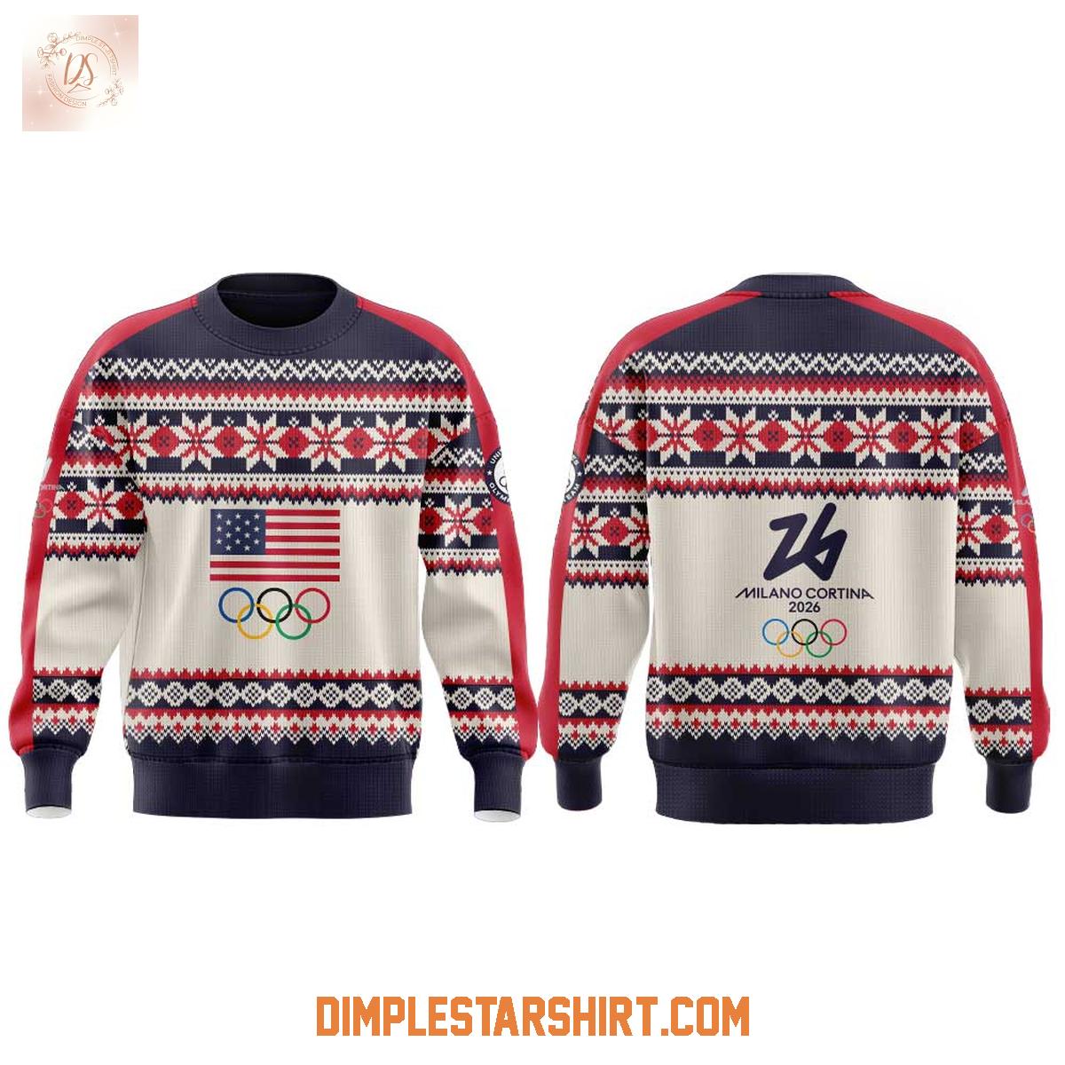 The design features a festive, knitted-inspired pattern incorporating the iconic colors of the American flag. The instantly recognizable Olympic rings are prominently displayed alongside the US flag on the front, symbolizing the spirit of international competition and national unity. The Milano Cortina 2026 logo on the back further commemorates this prestigious event. This combination creates a bold and eye-catching look that is both sporty and undeniably stylish, making it a standout piece in any wardrobe.
