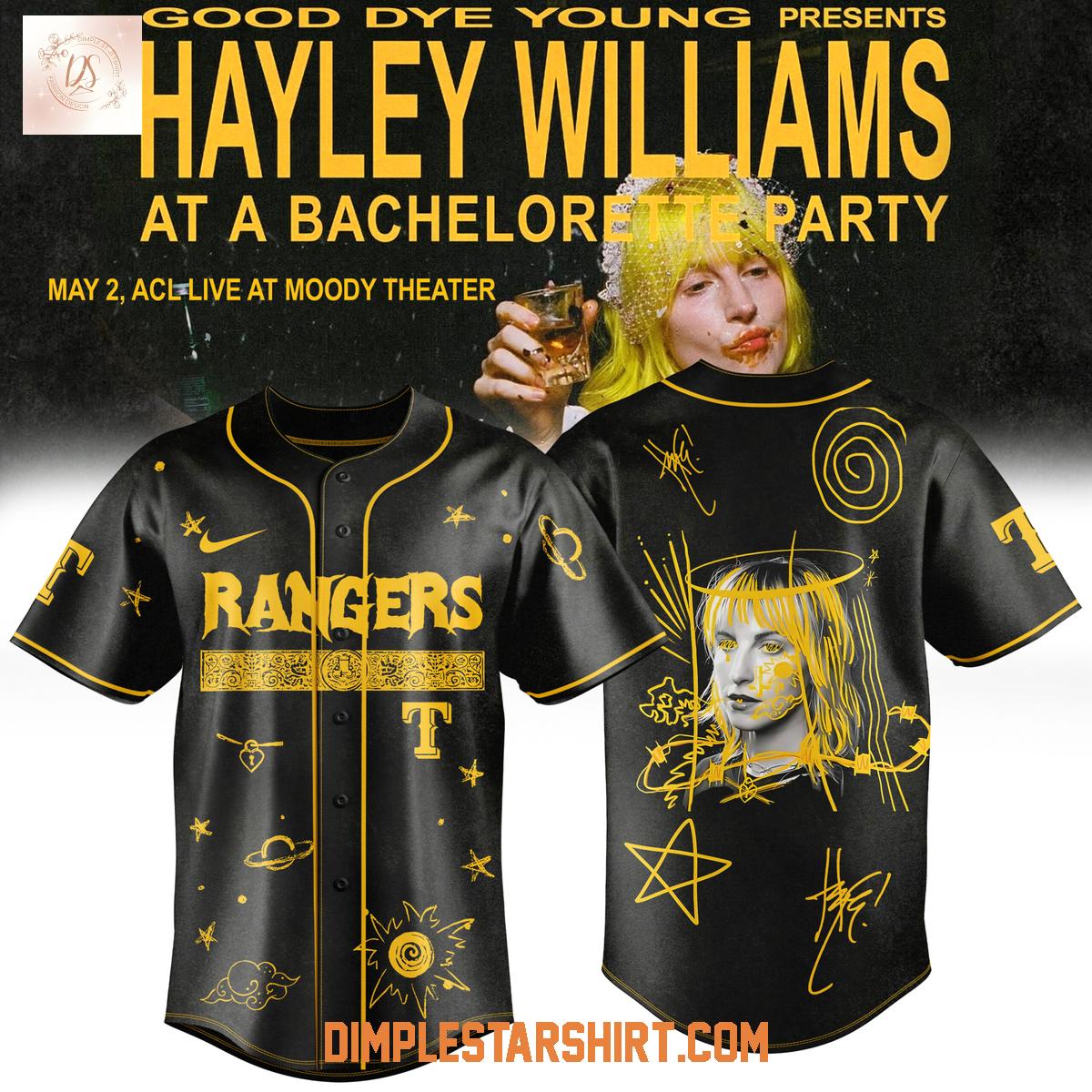 The jersey features a sophisticated black base, sharply contrasted by vibrant yellow accents that immediately capture attention. The classic "Rangers" logo is proudly emblazoned across the chest, signifying team allegiance, while the back showcases unique artistic elements, including a stylized portrait of Hayley Williams. These artistic details pay homage to her captivating music and dynamic stage presence, transforming the jersey into a wearable piece of art.