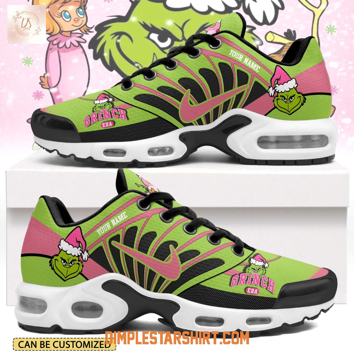 A keen eye will appreciate the precise character integration, featuring the Grinch prominently on the side panels, complete with his iconic smirk and a festive Santa hat. The "Grinch Era" text further solidifies the theme, while the "YOUR NAME" customisation option truly elevates these shoes, allowing for a personalised touch that makes them uniquely yours. This bespoke detail transforms them from mere footwear into a cherished, individual statement piece.