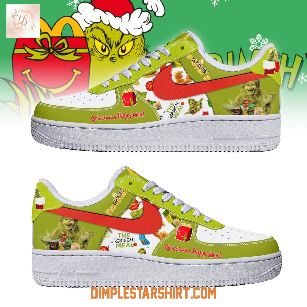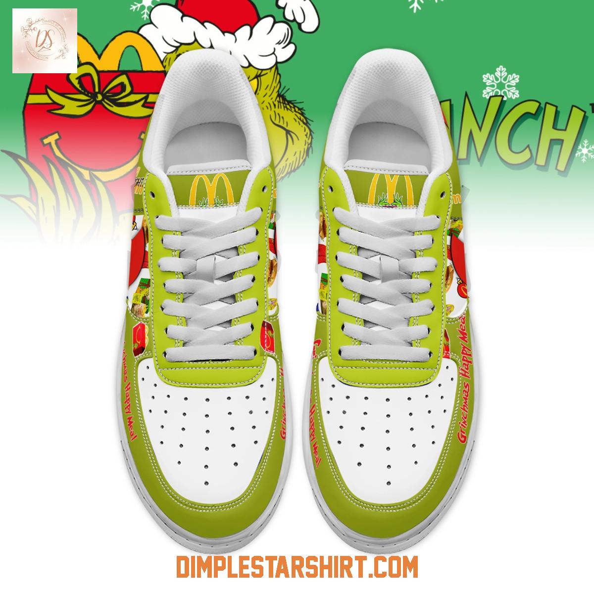 These custom-designed sneakers boast a vibrant color palette that captures the essence of the Grinch's mischievous spirit. The bright green overlays and white base create a striking contrast, while the red swoosh adds a touch of classic McDonald's flair. Detailed graphics featuring the Grinch and Happy Meal elements are printed across the shoe, creating a unique and festive aesthetic.