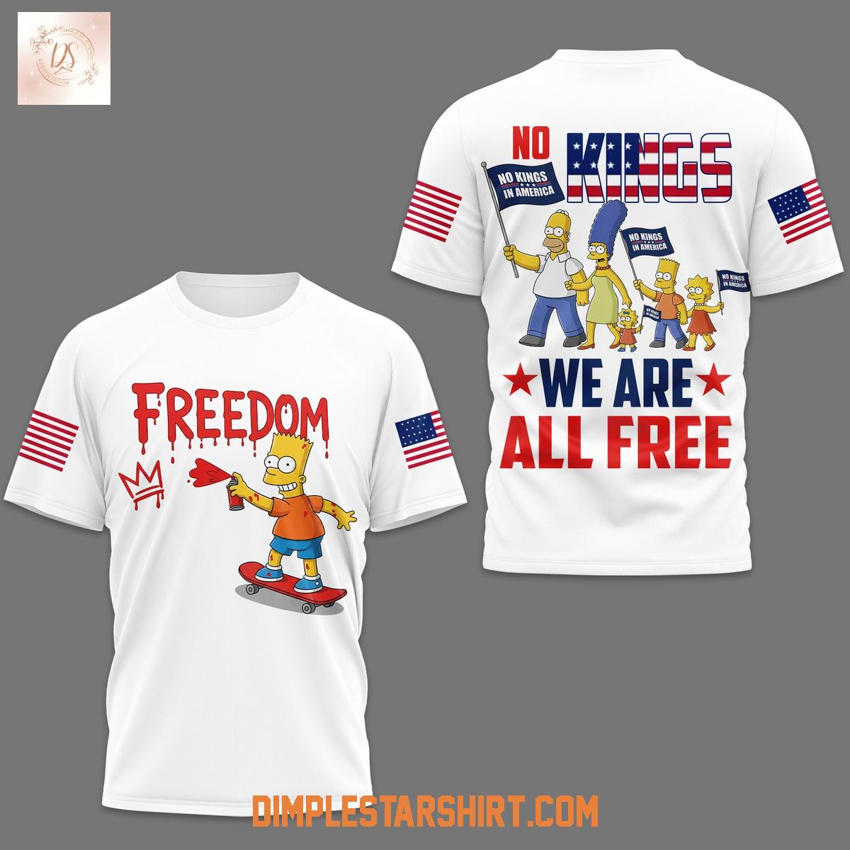 Flipping to the back reveals the entire Simpsons family – Homer, Marge, Bart, Lisa, and Maggie – marching resolutely. Each character proudly carries a flag emblazoned with "NO KINGS IN AMERICA," echoing the shirt's core message. Above them, the powerful phrase "NO KINGS" is rendered in a distressed, patriotic red, white, and blue design, culminating below with "WE ARE ALL FREE," flanked by bold red stars. This collective imagery powerfully communicates a unified stance for democratic ideals.