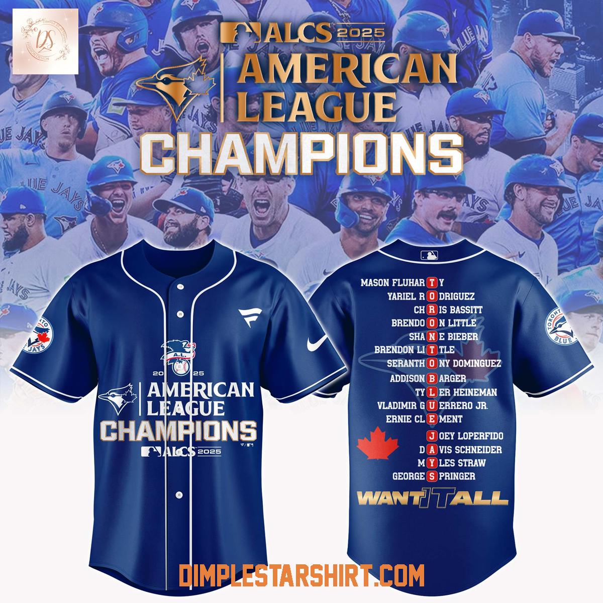 Dominating the chest is the powerful "ALCS 2025 AMERICAN LEAGUE CHAMPIONS" graphic, boldly proclaiming the team's success. This intricate emblem, complete with the Blue Jays bird and an MLB-style logo, captures the spirit of victory and the excitement of a championship season. It’s a design that resonates deeply with devoted fans.