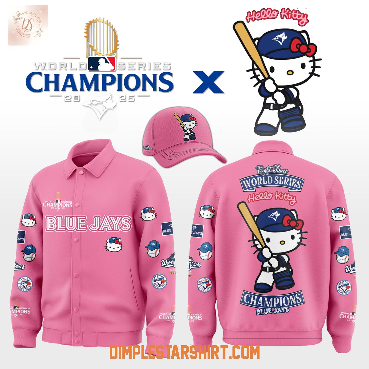 The reverse of the jacket features an even grander celebration: a large, dynamic graphic of Hello Kitty, fully geared in a Blue Jays uniform and cap, confidently holding a baseball bat. Above this endearing image, the declaration "Eight Times World Series Hello Kitty" is boldly proclaimed, alongside "Champions Blue Jays" below, making a powerful, celebratory statement about the team's potential dynasty.