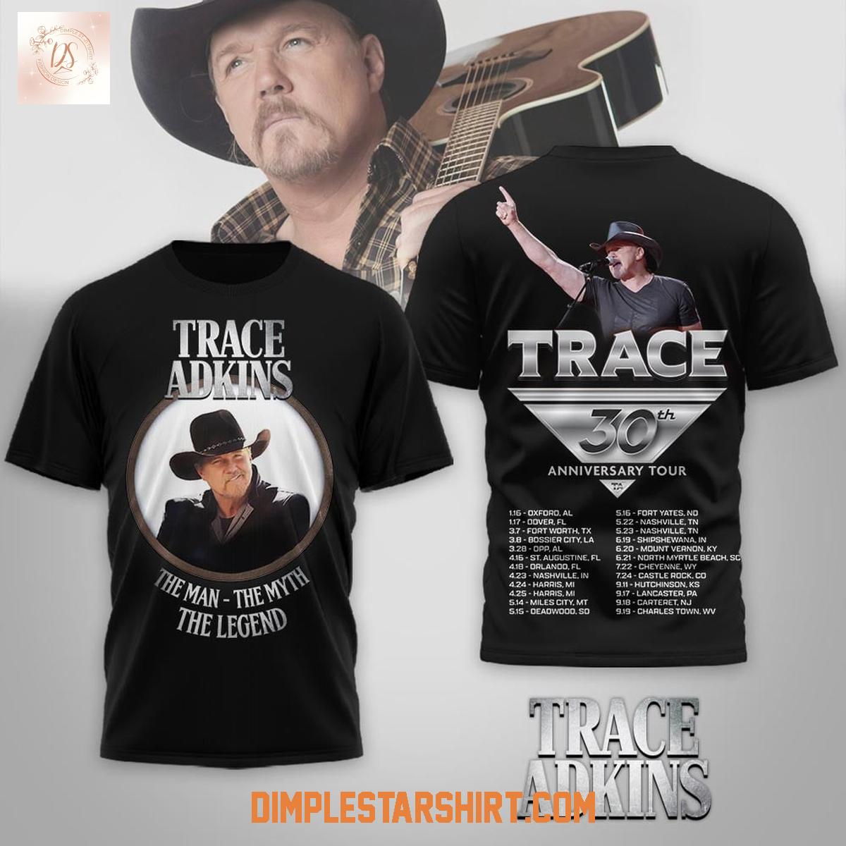 The front of the shirt features a striking and memorable image of Trace Adkins, powerfully capturing his commanding stage presence and undeniable charisma. The back of the shirt proudly displays the "30th Anniversary Tour" logo, alongside a comprehensive list of tour dates and locations, effectively commemorating this special and unforgettable musical journey. The high-quality print is meticulously designed to withstand regular washing, maintaining its vibrant colors and sharp details over the long term.