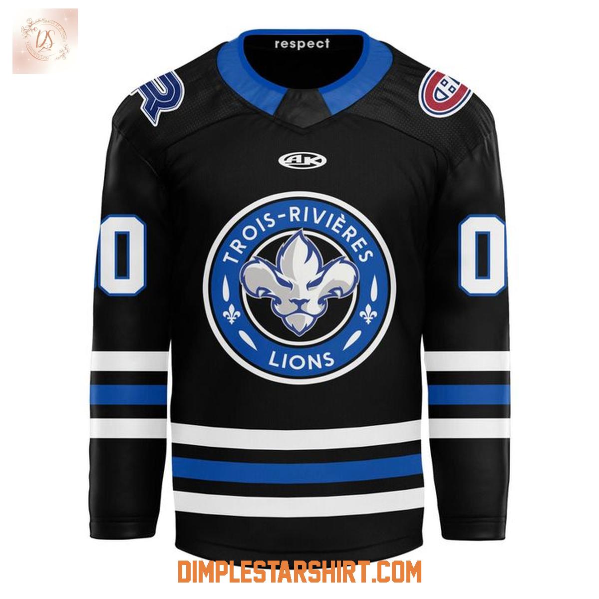 The jersey features a bold black base, providing a powerful backdrop for the team's iconic royal blue and crisp white accents. Dominating the front is the official Trois-Rivières Lions circular crest, prominently displaying the stylized lion head and fleur-de-lis, symbolizing both strength and local heritage. Further demonstrating the team's professional ties, a distinctive Montreal Canadiens logo patch adorns the right shoulder, a nod to the Lions' affiliation that true hockey enthusiasts will immediately recognize and appreciate.