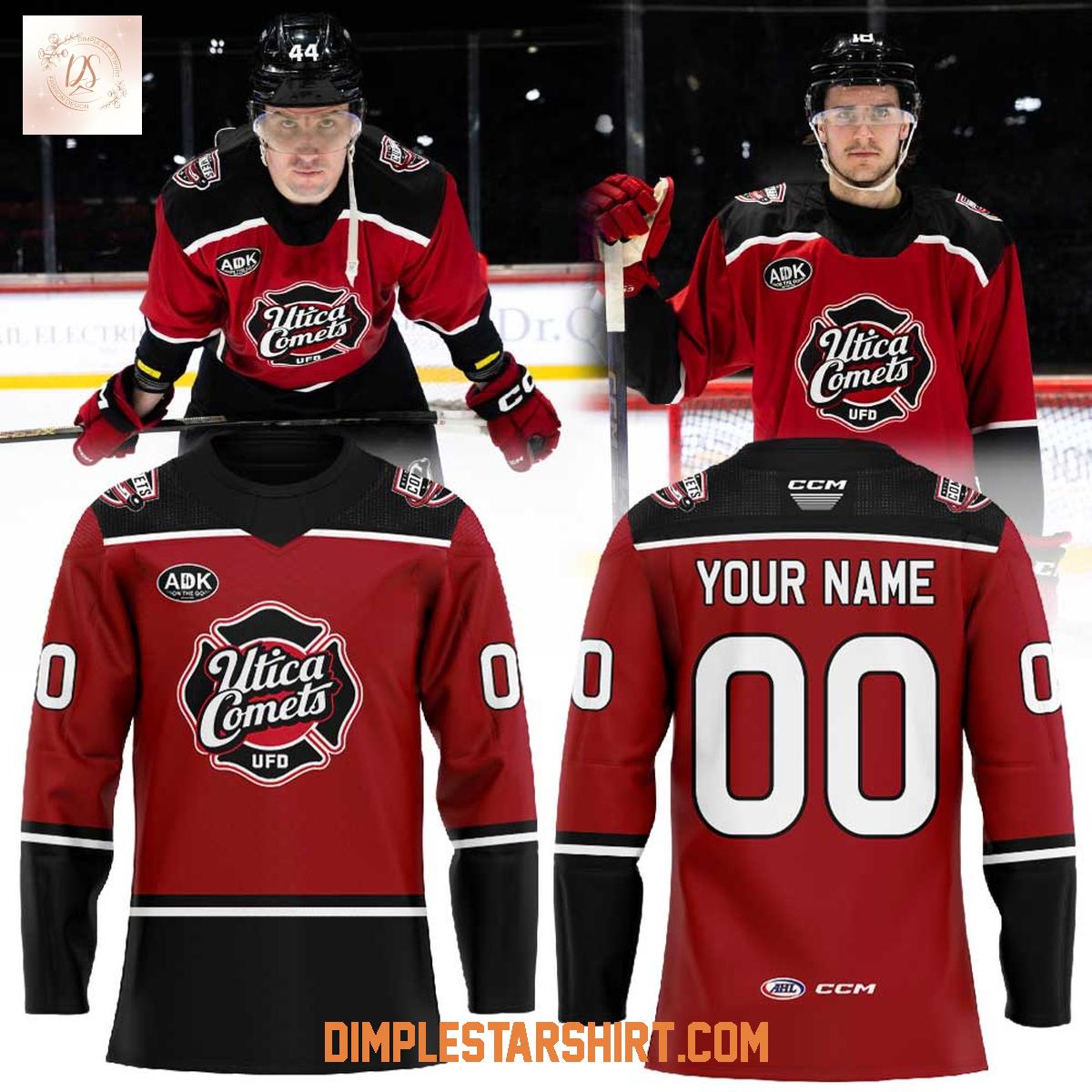 The jersey features the iconic Utica Comets logo prominently displayed on the front, redesigned with a subtle nod to the firefighting community. The color scheme incorporates the team's classic colors, accented with black and white stripes, creating a bold and stylish look. The high-quality construction ensures it can withstand the rigors of cheering from the stands or even a friendly game of street hockey.