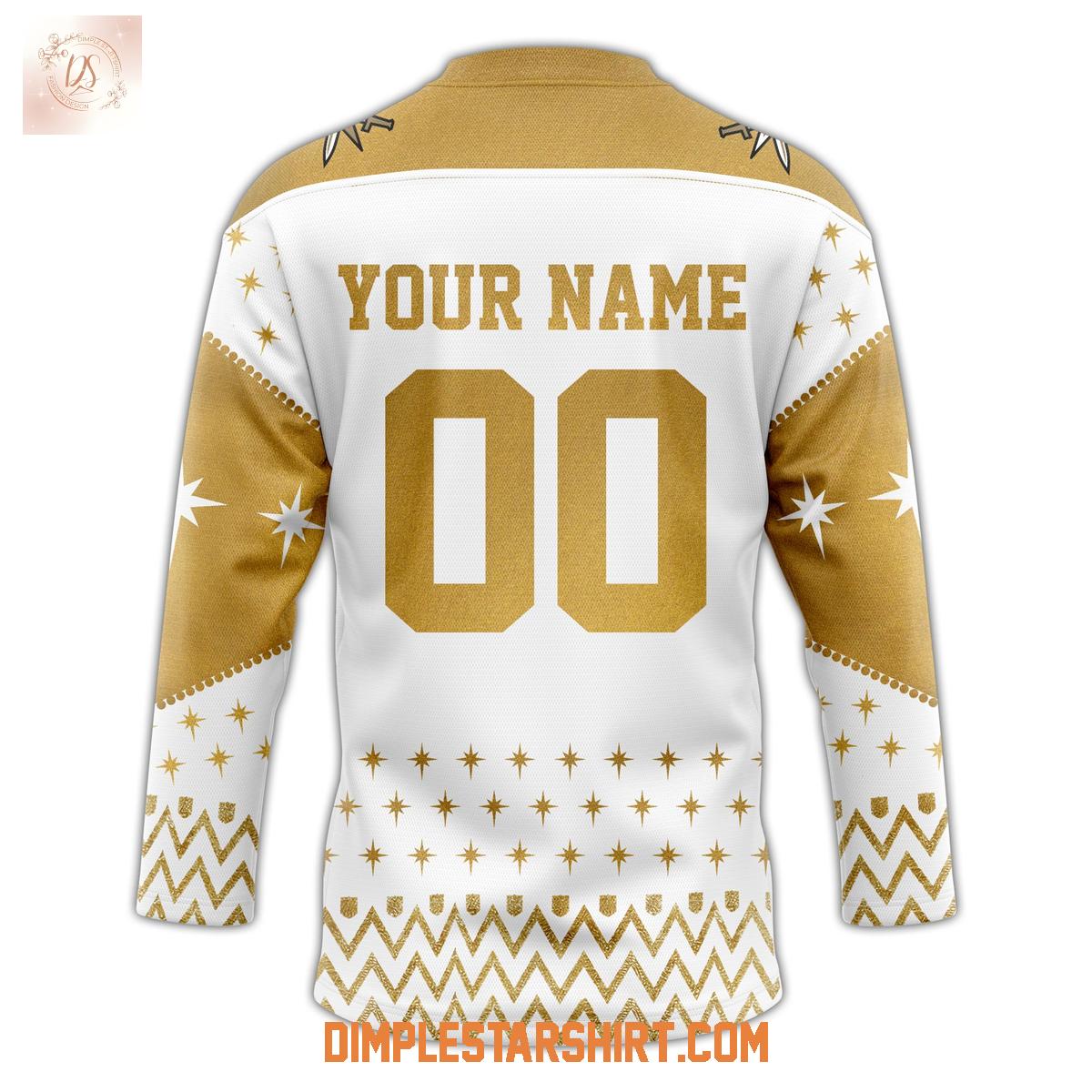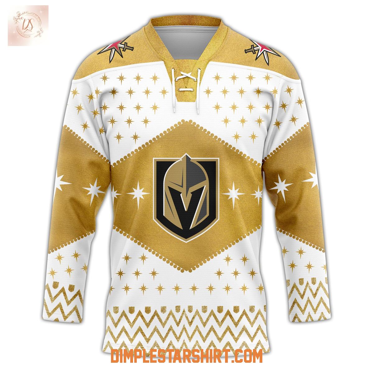 This holiday sweater jersey features the iconic Vegas Golden Knights logo prominently displayed on the front, surrounded by festive holiday-themed designs. The gold and white color scheme embodies the team's colors while incorporating classic Christmas elements like snowflakes and geometric patterns. The design is carefully crafted to strike a balance between team pride and holiday aesthetics, making it a versatile addition to your wardrobe.