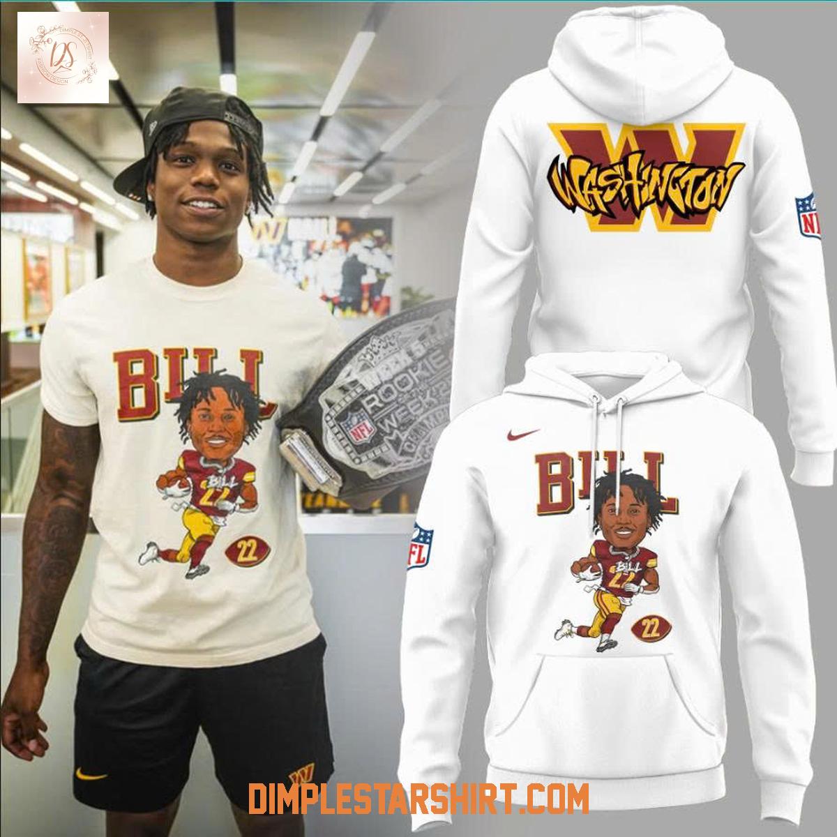 The front of this striking white hoodie proudly features "BILL" in bold, maroon and gold lettering, immediately drawing the eye. Below, a vibrant, detailed caricature of Brian Robinson Jr. is depicted in action, wearing his iconic number 22 and the team's colors, ready to break through the line. This playful yet powerful graphic embodies the "Run Bill Run" chant that echoes through FedExField, celebrating every yard gained.