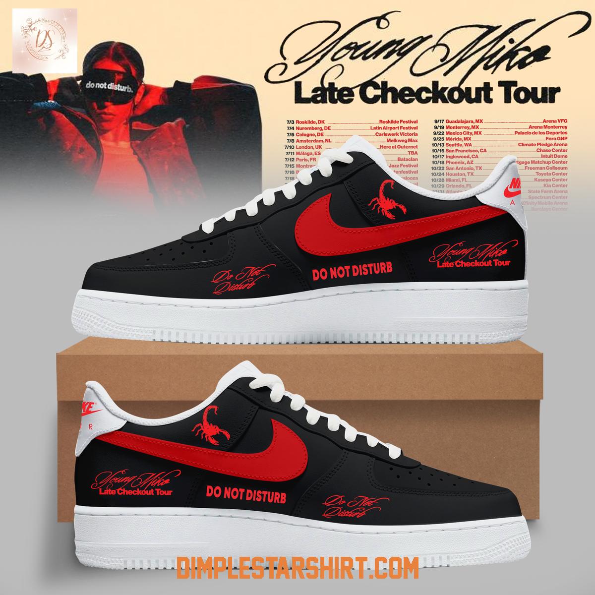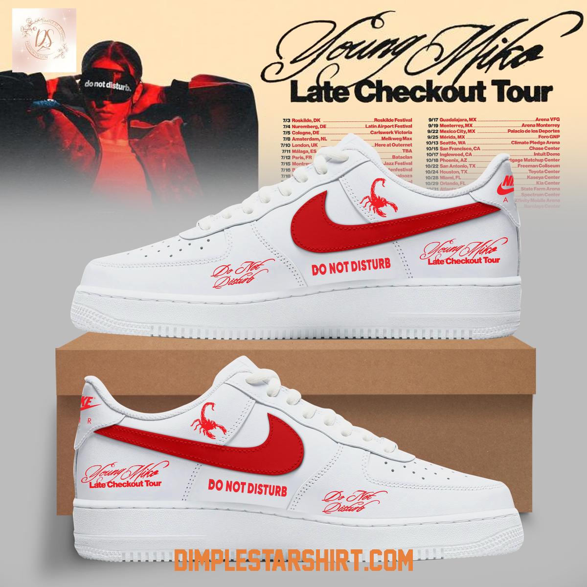 These Air Force 1s feature a crisp white base, providing a clean canvas for the vibrant red accents that bring the design to life. The iconic swoosh is rendered in a bold red, complemented by tour-specific details like the "Young Miko Late Checkout Tour" script and a striking scorpion graphic, adding a unique and personal touch to the classic silhouette. The phrase "Do Not Disturb" is printed as well, capturing the artist's persona.